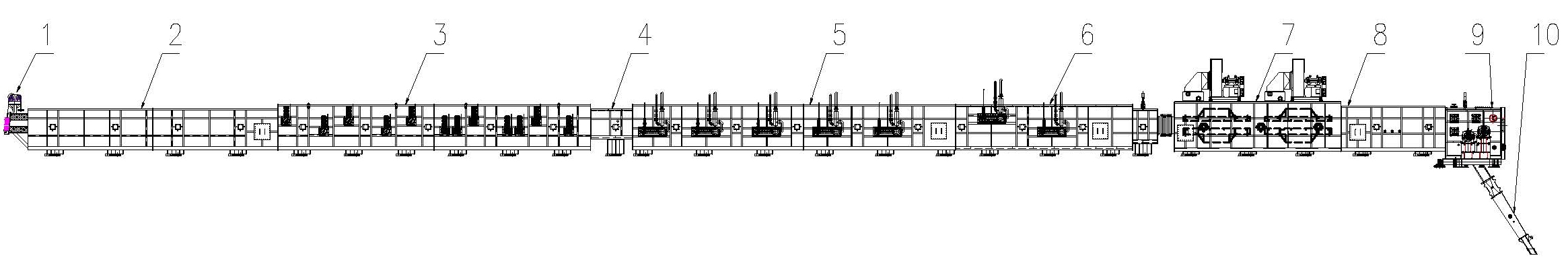 1. Entrance tight 2. Pr-heating section 3. Non-oxidation burning section 4. Furnace throat 5. Radiant tube heating section 6. Radiant tube soaking section 7. Cooling section 8. Balance section 9. Heat chamber 10. Furnace nose